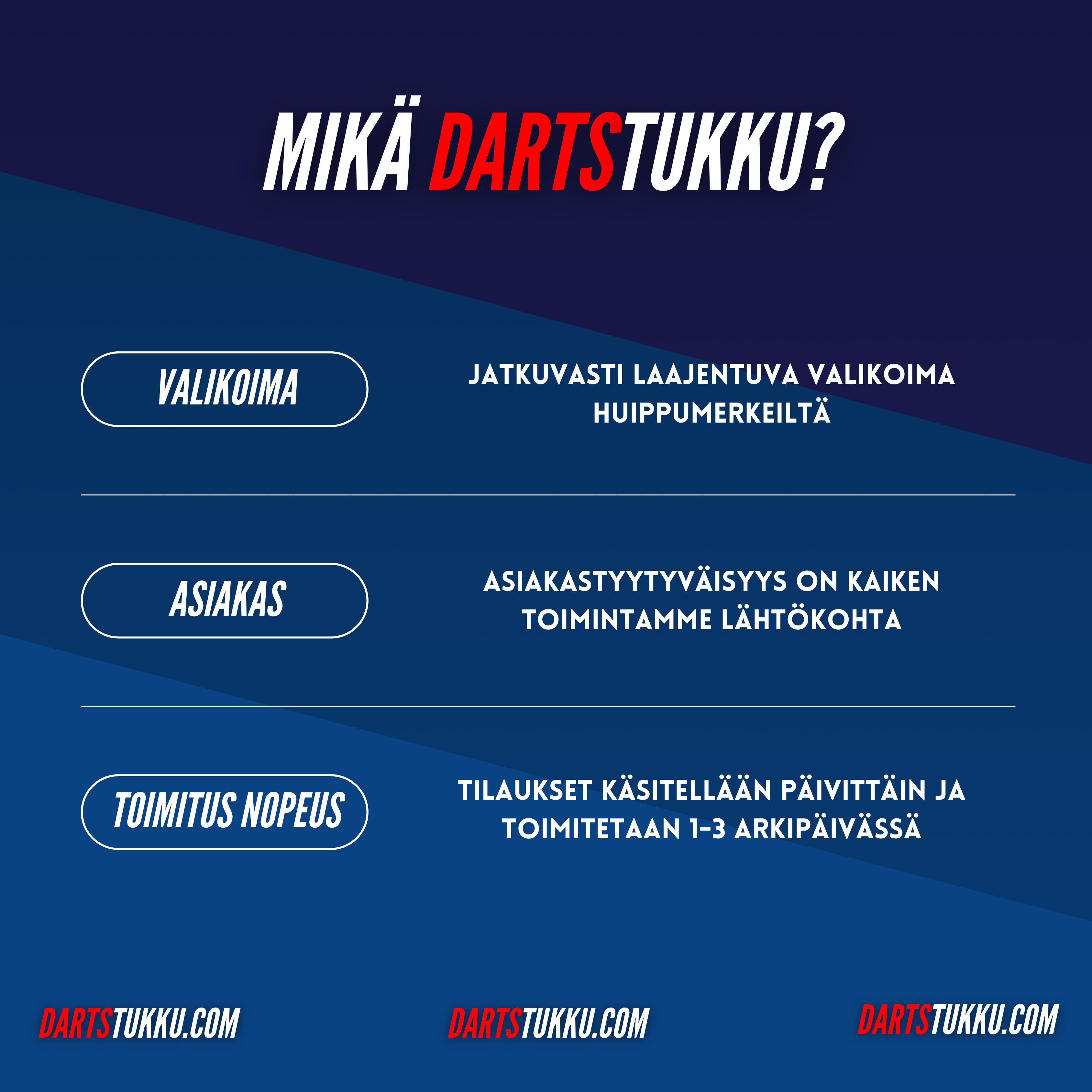 Dartstukku on uusi suomalainen darts -verkkokauppa, josta löydät jatkuvasti laajentuvan valikoiman darts -tuotteita huippumerkeiltä. Yrityksemme toimii useamman verkkokaupan takana, ja asiantunteva tiimimme varmistaa tilauksien laadukkaan sekä nopean toimituksen.