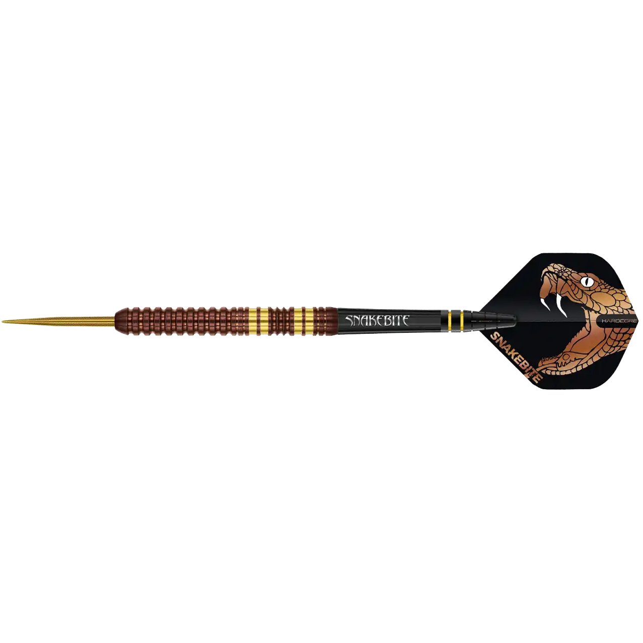 Rinnakkaisprofiilinen barreli sisältää symmetriset pyöristetyt eturenkaat sekä useita takaosan uria, jotka tarjoavat joustavan pidon ja mahdollistavat heittovoiman säätelyn tilanteen mukaan. Kuparisävyinen PVD-pinnoite tuo barrelille näyttävän ja kestävän viimeistelyn, ja aidosti kullatut urat viimeistelevät ylellisen ulkonäön, joka on tunnusomainen Snakebite-sarjalle. Kokonaisuus sopii kilpapelaajalle, joka arvostaa selkeää otetta, hallittua tuntumaa ja persoonallista designia ilman kompromisseja suorituskyvyssä.